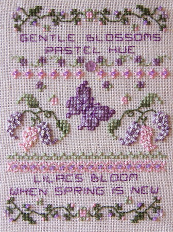 I can finally show this HD to you, since it has been safely received. This is Lilacs from Lavender Wings. It was my Seasonal Exchange piece for Annette. I really enjoyed stitching this – yes, even all those Colonial Knots! I finished it off as a cube-it, inspired by a couple of other stitching bloggers who had recently done the same. I was kind of winging it though, as I only had some vaguely remembered instructions to go by (I think they might have been from Summer Truswell’s stitching pages, but her articles are no longer available since they all went into her book, which I really must buy sometime). Anyway, it turned out quite beautifully, but being Miss Forgetful, I didn’t manage to take a picture of it finished before sending it off, duh! Annette has since supplied me with one though, which you can see here.