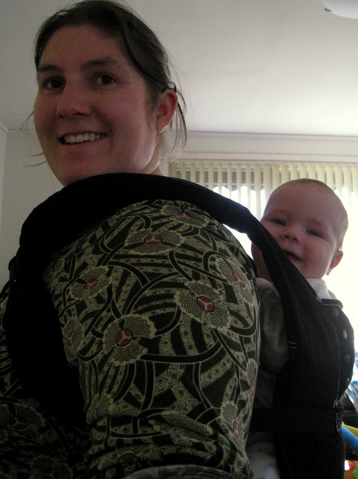 So I succumbed, and ordered an Ergo Sport. Our very cheery postie delivered it this morning, and we’ve spent the day trying it out. Verdict = winner. (Though the hair-grabbiness will have to be stopped :grr: )