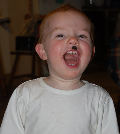 This impromptu impersonation of Charlie had us all in fits. This was pizza night about six weeks ago, and we had been playing with sequins earlier in the week, sticking them on our noses and whatnot. Niamh plonked this piece of olive under her nose and (obviously) though it incredibly hilarious. Her sense of humour is wicked.