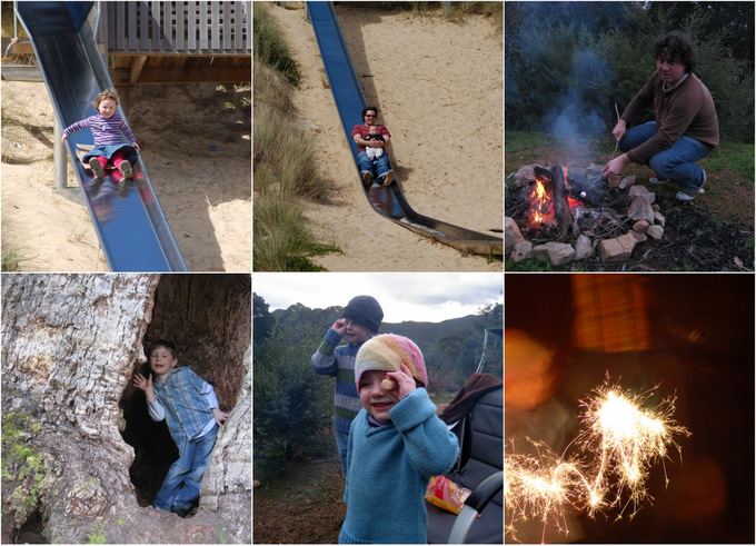 We headed down to Port Fairy, on the coast of western Victoria, for three nights, and then headed north to Halls Gap in the Grampians mountain ranges for another three. The weather was a little volatile, but we did manage to get out and explore a bit, spend time on the beach (albeit rugged up), walk a couple of short easy bushwalks, and cook a few marshmallows on a campfire. We also sought out cheese, chocolate, fabric and devonshire teas – all pretty standard requirements for our family holidays ๐ In the rainy bits, we very happily lazed about inside – there might have even been a bit of crochet and (shock!) a bit of cross-stitch.