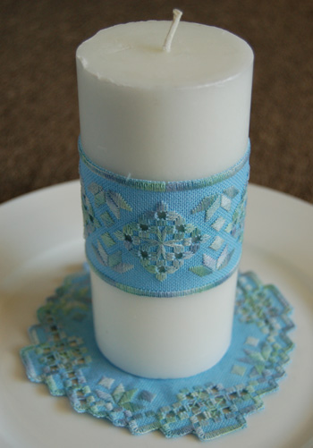 Haze stitched me this lovely candle wrap and mat for the Hardanger exchange on the Rotation BB. It’s taken a little while to arrive, it’s been on a bit of a world cruise, actually ๐Ÿ™‚ Thanks Haze, I love it!