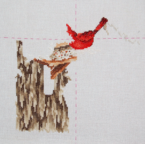 Here’s the stitching I’ve managed since you last saw me. I put about fifteen hours into Juli’s UFO before sending it on its merry way. Unfortunately, I neglected to get a ‘before’ shot, and Claire’s website seems to have disappeared, so I can’t point you to her picture. You’ll just have to believe me ๐Ÿ™‚ I stitched all of the tree (brown) you see here. Just tree. Treetreetreetreetreetree. Bo-oring, lemme tell you, but hey, I didn’t have to pull out too many colours of floss or learn too many symbols, so it was the perfect no-brain stitching for me. Plus, it advances the project (which will eventually look like this), and someone else will thank me that they don’t have to do that slab of tree!