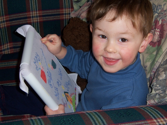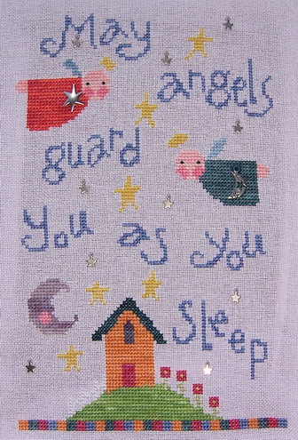 My needle is on fire! Another finish, and this time you get photos ๐Ÿ™‚ This is Little Angel Birth Sampler by Sisters and Best Friends. It’s not something I’d usually stitch, and I kind of lost interest for a while, but I think the parents-to-be will like it. I stitched almost all the lettering today, plus 3 of the stars, half an angel, and attached all the charms. Obviously the baby’s name and birth details are yet to come, but that’s only a little bit of backstitching below the house. The babe is due in a month, so I’m pleased I’ve finished early. The image links to a closer look. But wait, there’s more! Check out who actually did the stitching. What a cutie!