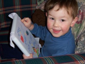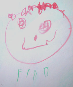 Also, because I think it’s cute, and because it needed preservation (darn the transitory nature of the whiteboard), here’s a self-portrait Finn drew with his new markers from Santa: