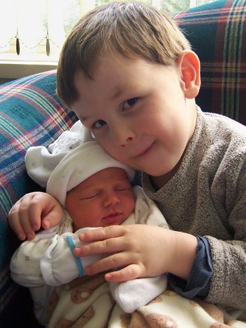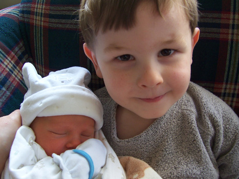 Apart from a rather unattractive heat rash spreading across her neck and face, Niamh is definitely doing really well. No smiles yet (Finn smiled in the forth week… not that we’re keeping score or anything… !) but I’m sure they’re just around the corner. She’s still largely a peaceful baby, and rapt in her big brother. I captured some magic two days ago: