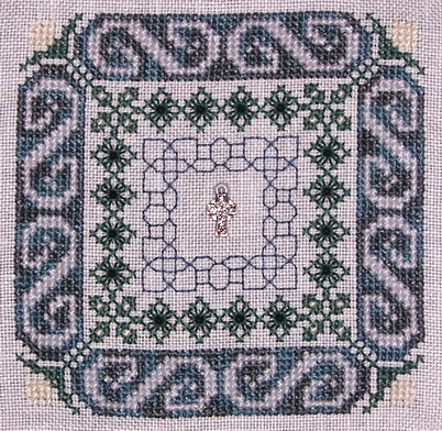 May I present Elizabeth’s Designs’ Celtic Cross, aka “My first finish of 2006, and about darned time” :giggle: I started this Monday night – a new start to celebrate finishing, of course, and finished it just now. I had to really buckle down at the end, I was seriously over that border. I didn’t time this, but I’d estimate there’s about 12-15 hours stitching in it.