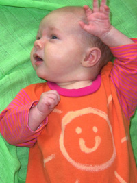 Things have calmed down a bit since then, but still we haven’t had the sleep-through. Even dropping down to one feed a night would be fine, but at the moment she has one longish (5 or 6 hours) sleep, starting sometime between 7 and 8p.m., then usually feeds at 1-something-a.m. and 4-something-a.m., and is then ‘up’ for morning by 6.30. Ack. And of course, I’m no good at going to bed at 7p.m. – I do actually like to stay up a bit and have ‘a life’ of sorts, (that’s code for ‘stare blankly at the television, or catch up on a blog or five’ – no energy to actually stitch or do anything useful!) So I go to bed by 10… 11… ish, and I don’t get that one long sleep. I know you’re all going to tell me to go to bed earlier – don’t bother, I already know what I should do. It doesn’t work for me. I’ll just have to hold out for her to drop a feed, instead. It’s just desperately difficult to avoid comparing her to Finn, who slept 8 or 9 hours in a hit from 6 weeks old (ok, not every night, but pretty routinely). She’s a different baby from Finn in pretty much every way, and really, I enjoy the fact that she’ll sleep in 2 or 3 hour slots during the day, where he only ever took 45 minute naps. That way, I get to spend time with Finn (when I’m a zombie, I’m not sure that it’s ‘quality’ time, but it’s time with him nevertheless), and recharge a little bit.