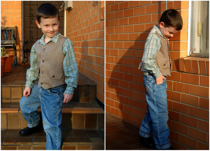 Students were encouraged to dress the part, so I hit the op-shop yesterday and dug up a checked shirt for a couple of dollars, and hit the sewing machine late last night to create this waistcoat (pattern is from Ottobre 3/09). Throw in a pair of (non-authentic, Esprit brand, also op-shop purchased) blue jeans and some elastic sided boots, and he should fit right in. Just don’t look too closely at the handiwork, ok, because late-night, sleep deprived sewing makes me incredibly sloppy. When will I learn not to leave things ’til the last minute?! Anyhoo, from a suitable distance it looks good – and don’t you love the model poses?! (Check the pinch-grip though – he’s so tense when being photographed!)